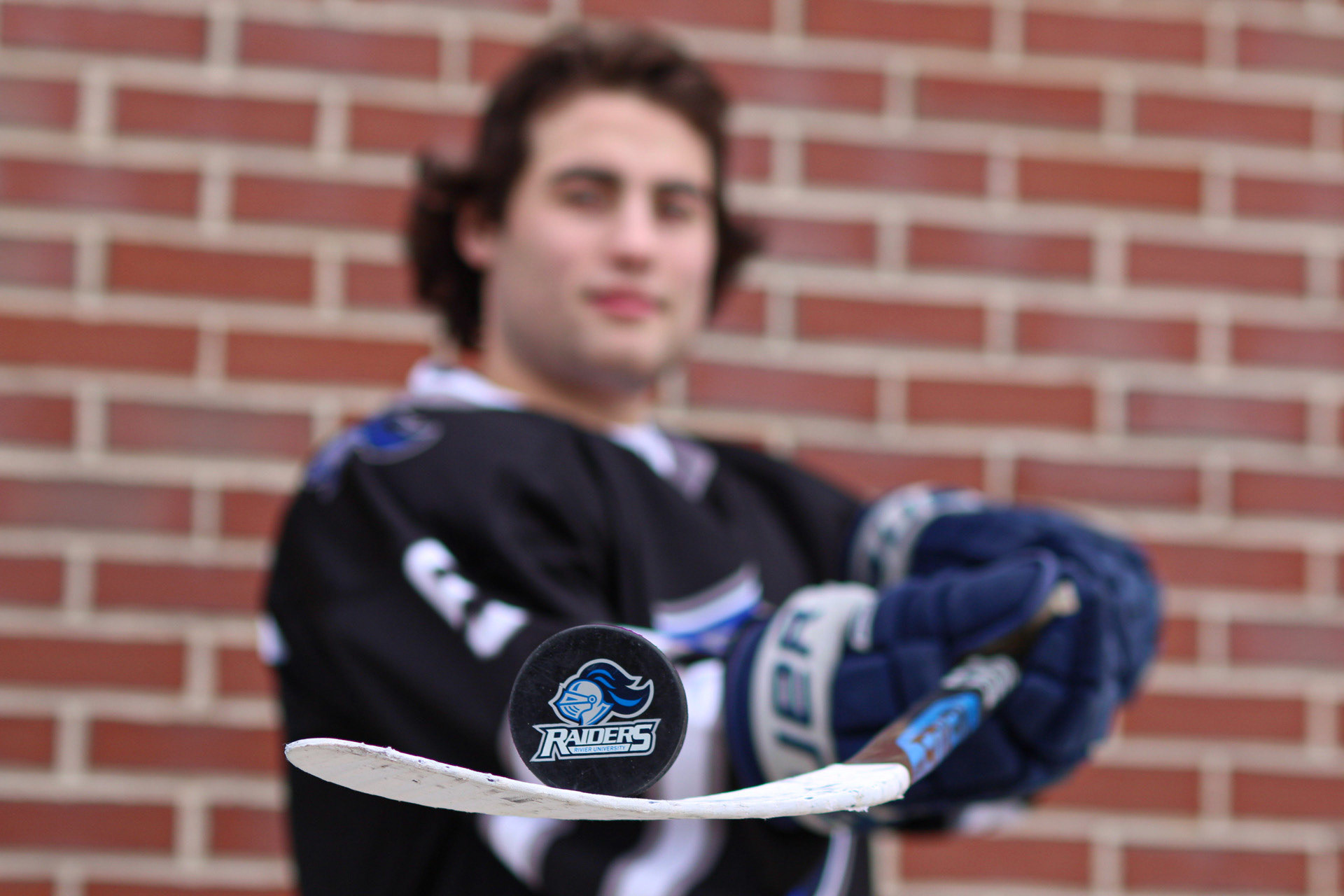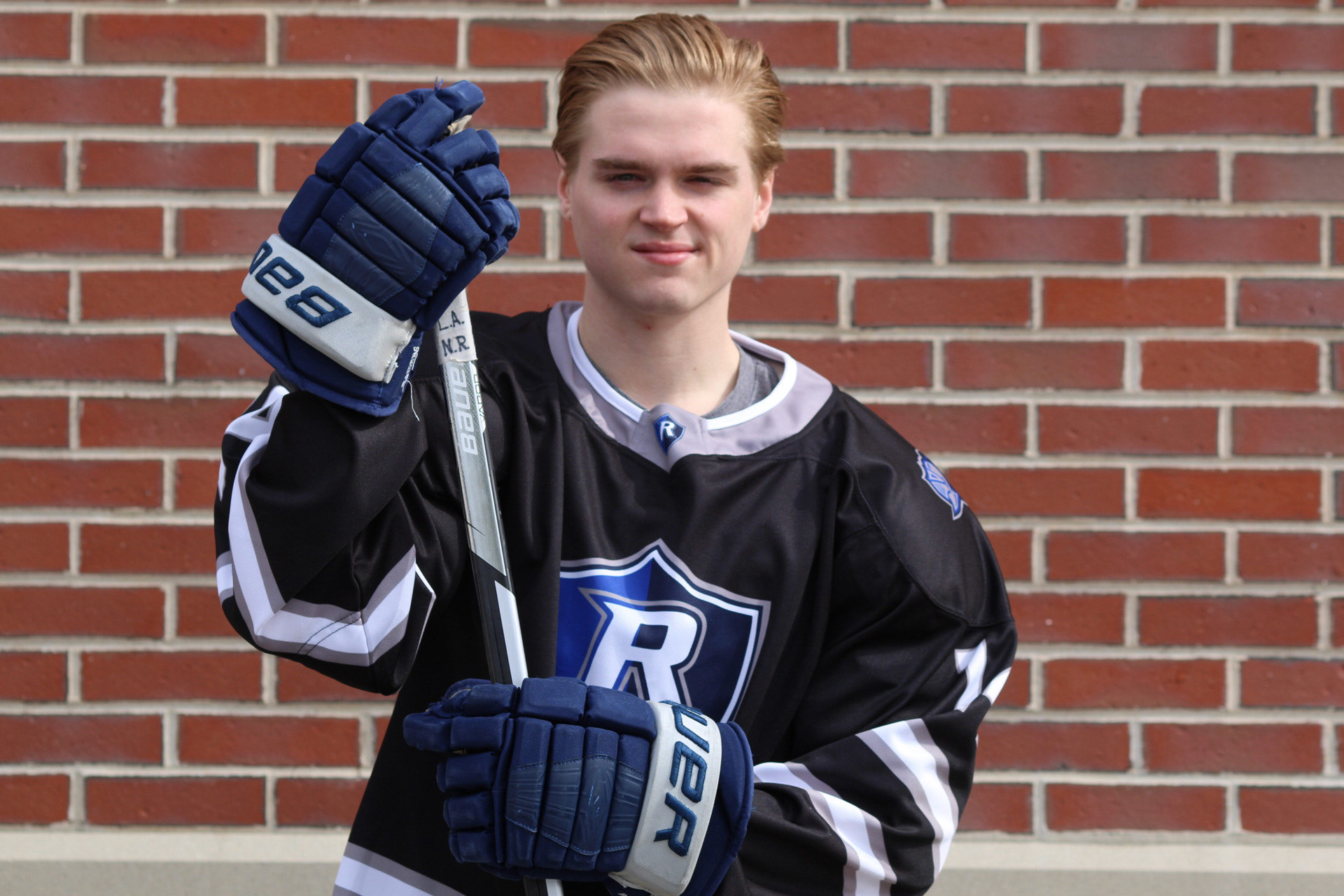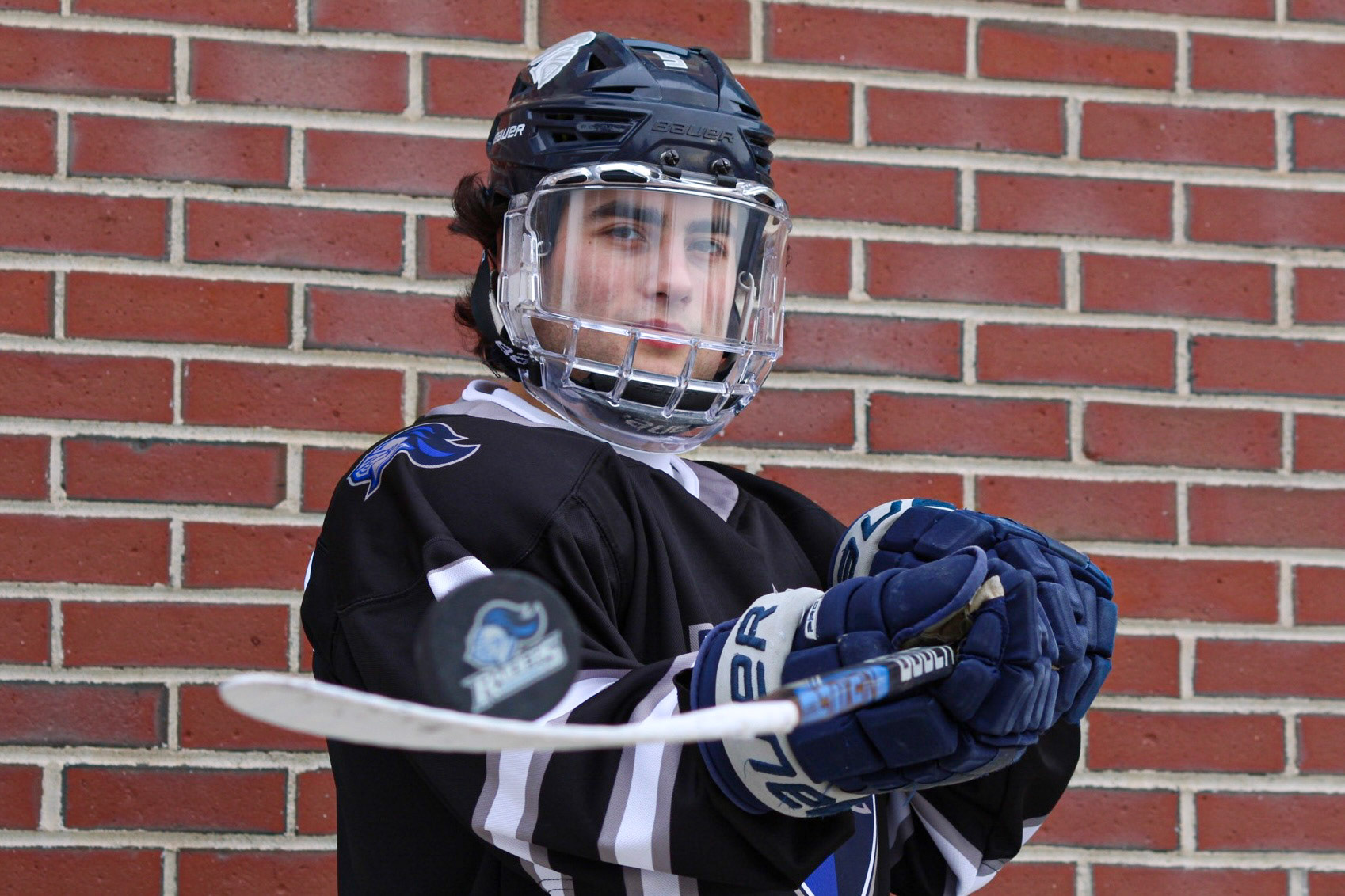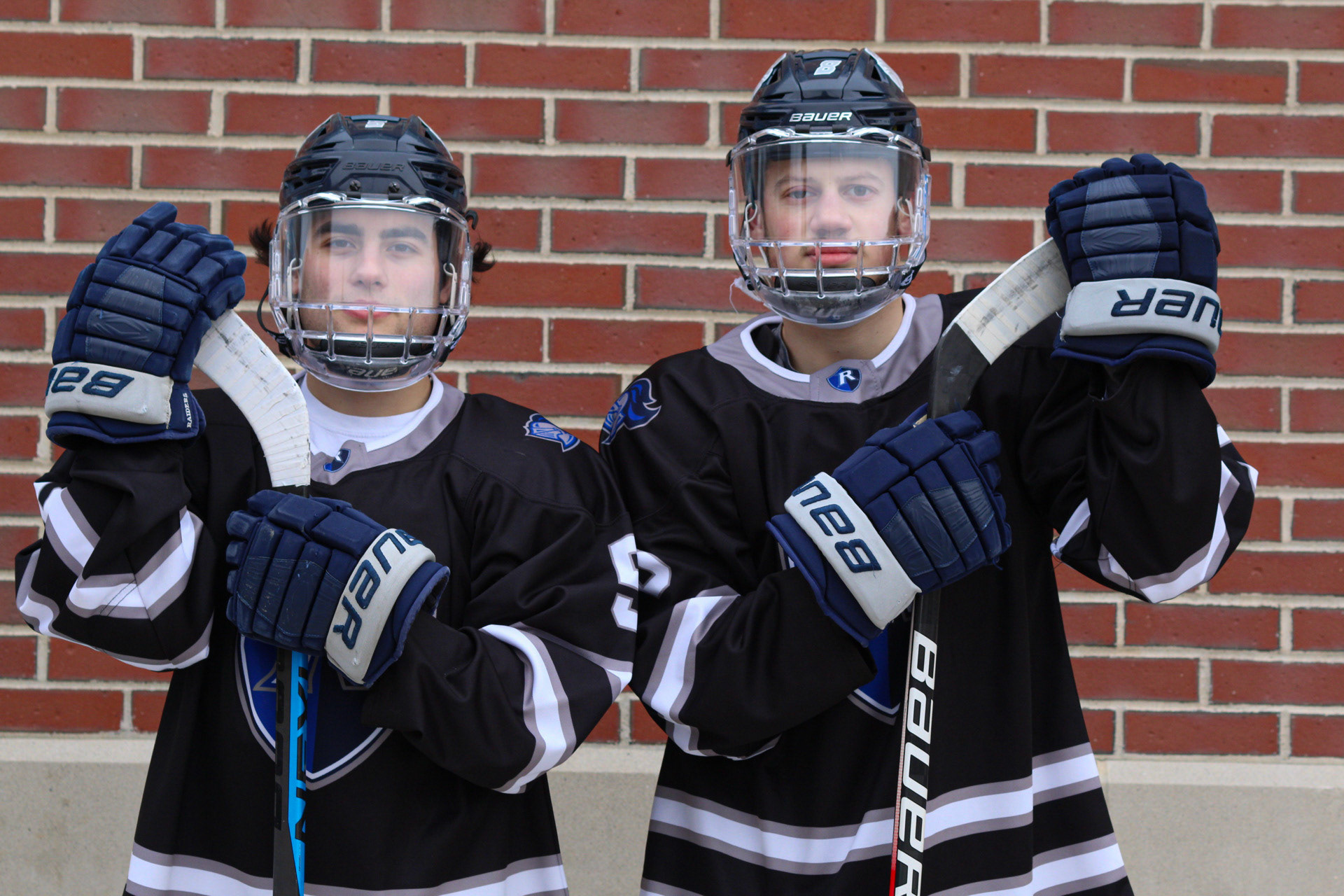 Hockey Portraits of 3 Rivier University Mens Hockey Players, MacCallum Brown #14, Alfred Rotiroti #8, and Jon Tavella #5