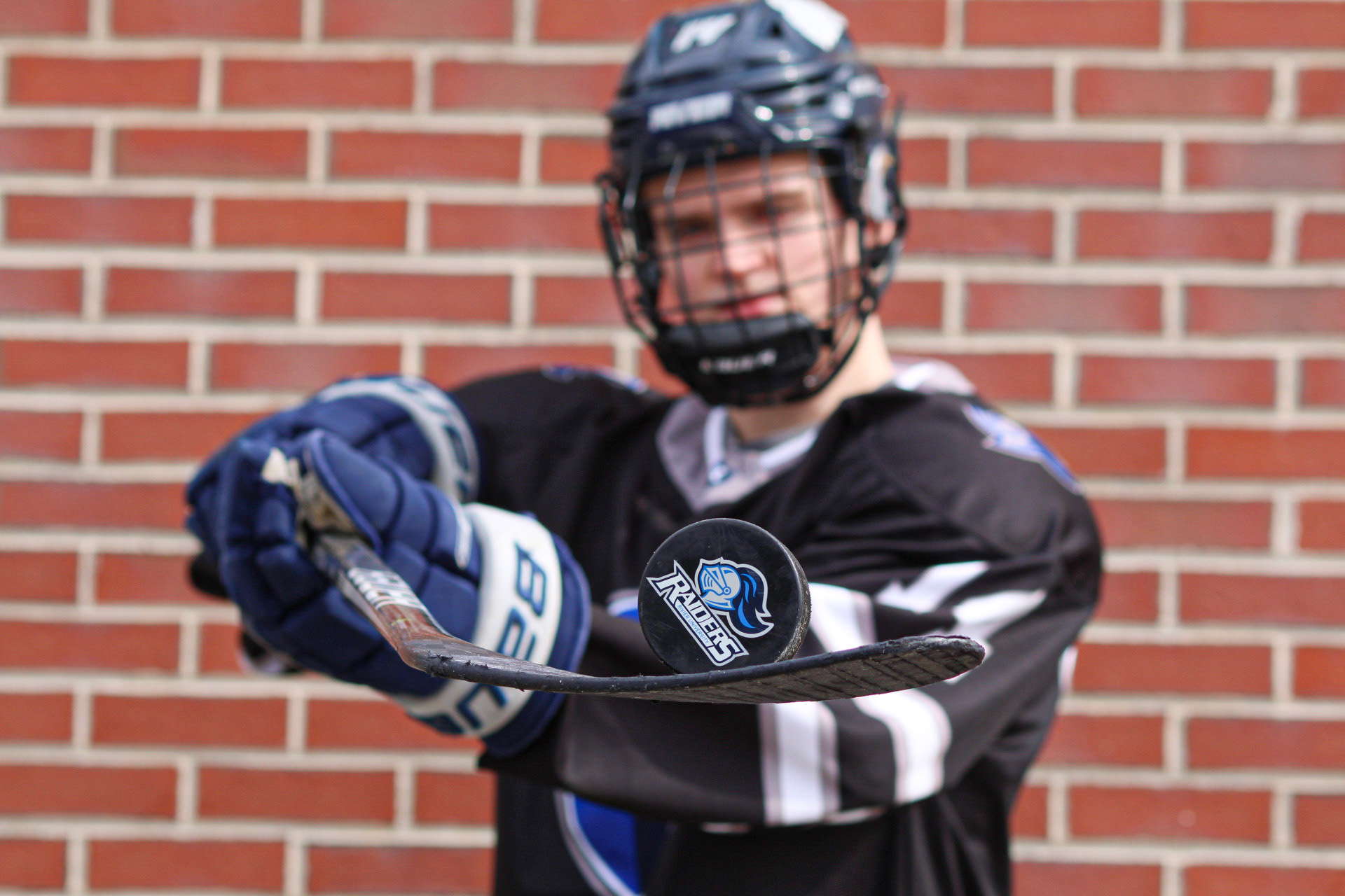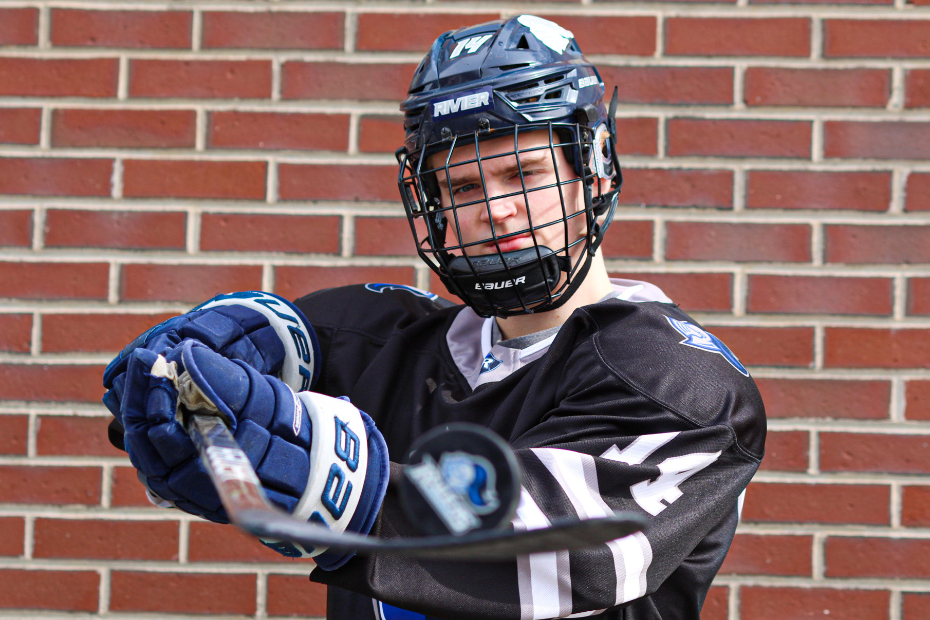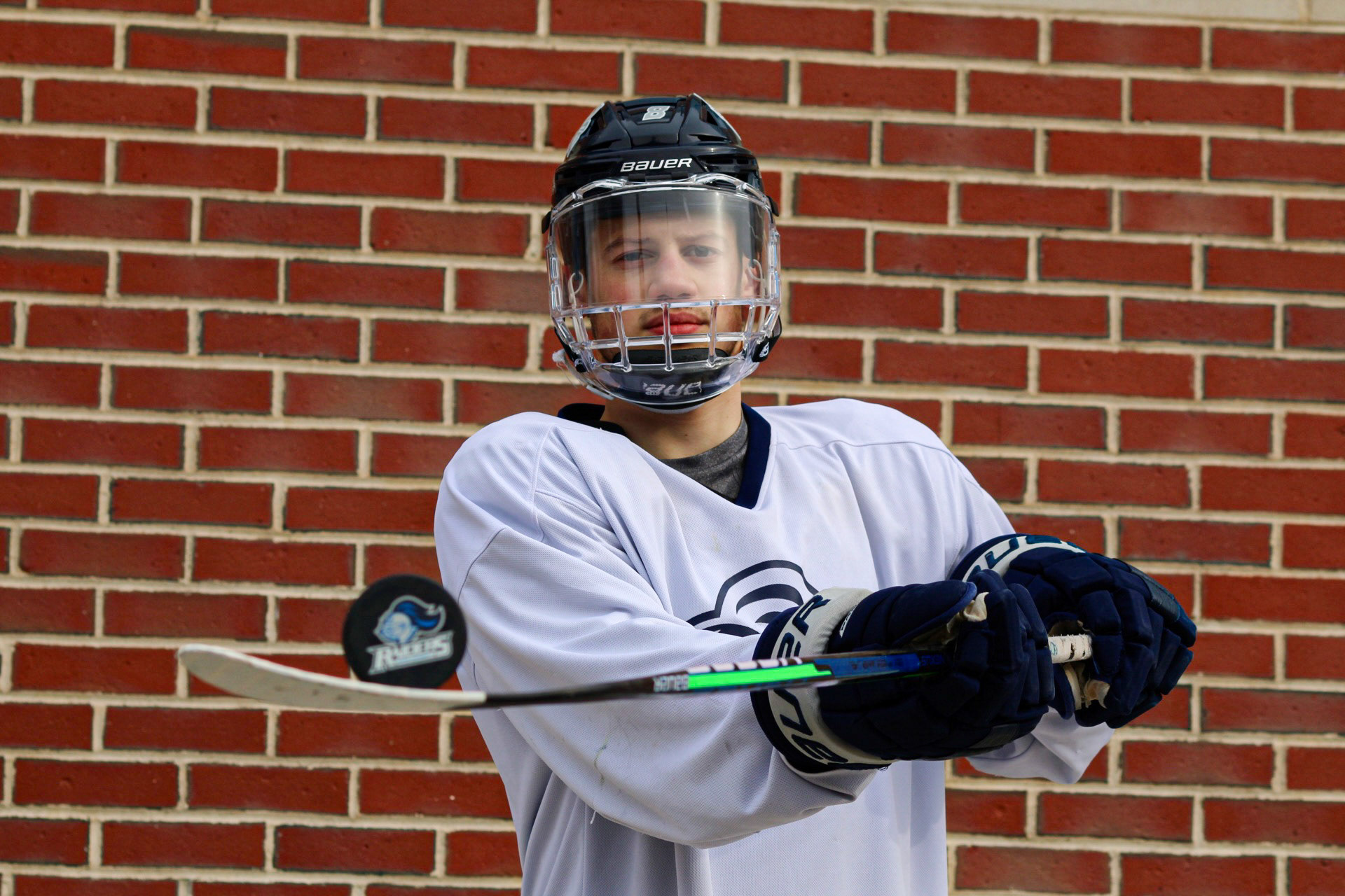 Hockey Portraits of 3 Rivier University Mens Hockey Players, MacCallum Brown #14, Alfred Rotiroti #8, and Jon Tavella #5
